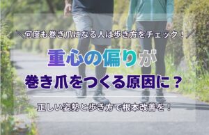 巻き爪は、一度治っても再発することがあります。その原因のひとつとして、日常の歩き方のクセが関係している場合があります。歩き方のちょっとした癖が、爪の端に過度な圧力をかけ、巻き爪を繰り返す原因になることもあるのです。